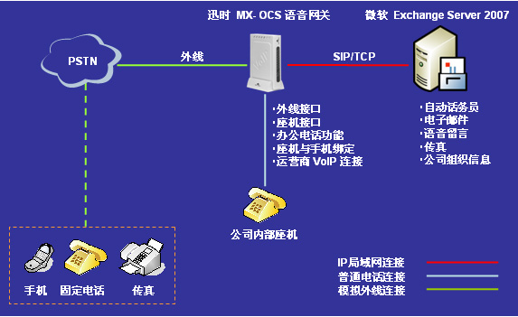 迅時通信針對微軟統一溝通解決方案,在2008年推出了MX-OCS系列辦公型VoIP語音網關。將微軟Exchange Server 2007 統一消息服務器與迅時通信MX-OCS網關集成而構成的解決方案(簡稱“1+1”方案),能大幅降低中小企業(yè)擁有統一溝通平臺的成本。