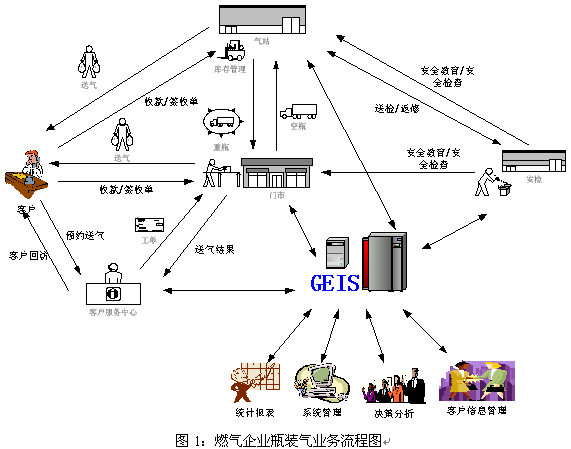 GEIS燃?xì)膺\(yùn)營管理信息系統(tǒng)的應(yīng)用是企業(yè)的長(zhǎng)期發(fā)展的驅(qū)動(dòng)力,它是一套以客戶服務(wù)接觸中心為龍頭、以運(yùn)營生產(chǎn)流程管理為龍身、以經(jīng)營分析為龍尾的閉環(huán)信息處理系統(tǒng)。它由客戶服務(wù)中心子系統(tǒng)、門市業(yè)務(wù)子系統(tǒng)、氣站管理子系統(tǒng)、安全搶修平臺(tái)和管理與集成模塊組成。實(shí)踐的事實(shí)告訴我們,它起到保持客戶忠誠度、提升企業(yè)品牌影響力、提高業(yè)務(wù)運(yùn)作效率、加快業(yè)務(wù)經(jīng)營決策和促進(jìn)企業(yè)持續(xù)發(fā)展的作用。