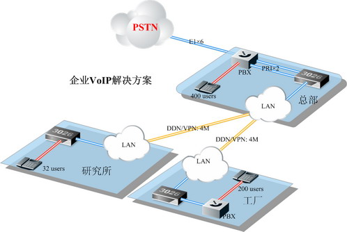 而目前網(wǎng)絡(luò)環(huán)境的改善,ADSL、寬帶的接入方式越來(lái)越普及,許多企業(yè)以及他們的分支機(jī)構(gòu)已經(jīng)通過(guò)各種方式接入Internet,鑒于Internet便宜的使用費(fèi)用,廣泛的普及范圍,基于VPN/DDN的VOIP解決方案,徹底解決了上述問(wèn)題,彌補(bǔ)了傳統(tǒng)電話網(wǎng)關(guān)的不足,且用戶可以根據(jù)自己需要,不斷擴(kuò)展IP語(yǔ)音端口,"邊發(fā)展邊升級(jí)",經(jīng)濟(jì)靈活,是一套性?xún)r(jià)比非常高的方案。