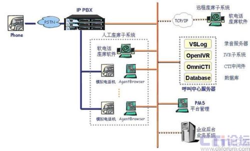 本方案采用IP-PBX 硬件平臺(tái)配合CTI系統(tǒng)軟件來(lái)建設(shè)呼叫服務(wù)系統(tǒng)。IP-PBX作為坐席接入的硬件接口平臺(tái),采用上海傲威科技有限公司自主研發(fā)的IP-PBX產(chǎn)品AVX2000pro來(lái)實(shí)現(xiàn),AVX2000pro提供標(biāo)準(zhǔn)RJ11固件接口,為坐席員提供語(yǔ)音接入,坐席員耳麥話機(jī)直接與RJ11接口互連。坐席電腦通過局域網(wǎng)口與CTI軟件服務(wù)系統(tǒng)互連。