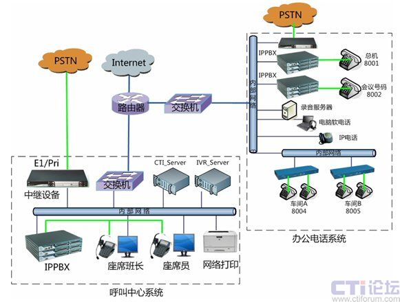 化。在總部核心機(jī)房將電話外線中繼接口與中繼網(wǎng)關(guān)設(shè)備連接,并通過內(nèi)部網(wǎng)絡(luò)對(duì)接到IPPBX,分別應(yīng)用于辦公電話系統(tǒng)和公司呼叫中心系統(tǒng)。設(shè)備用于公司辦公電話和公司會(huì)議系統(tǒng),可最大支持到30方會(huì)議,或多個(gè)小型獨(dú)立會(huì)議系統(tǒng)。各個(gè)不同的車間可以采用電話線之間接入分機(jī),或采用傲威AVG800的網(wǎng)關(guān)通過網(wǎng)絡(luò)接入,并注冊到IPPBX系統(tǒng)實(shí)現(xiàn)內(nèi)網(wǎng)網(wǎng)絡(luò)分機(jī)。對(duì)將來的分公司的辦公電話系統(tǒng),將不再使用傳統(tǒng)的PBX設(shè)備,而是直接利用IPPBX系統(tǒng),通過IP