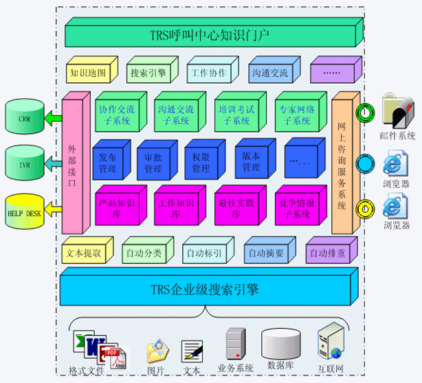 TRS Call Center 知識管理系統(tǒng)構(gòu)建在TRS企業(yè)級搜索引擎之上,融合了TRS文本挖掘技術(shù)和內(nèi)容管理技術(shù),全面包括知識庫、競爭情報、專家網(wǎng)絡(luò)、培訓考試、溝通交流和協(xié)作交流六大子系統(tǒng),以及發(fā)布管理、審批管理、權(quán)限管理、版本控制等系統(tǒng)管理模塊;并集成面向用戶的網(wǎng)上咨詢服務(wù)系統(tǒng),提供面向客戶管理信息系統(tǒng)(CRM)、自動語音應(yīng)答系統(tǒng)(IVR)、Help