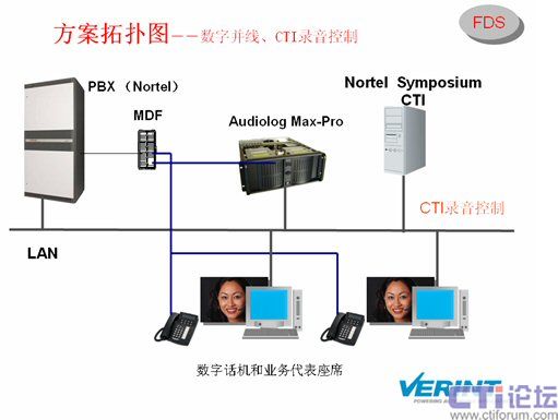 Audiolog錄音系統(tǒng)能和Nortel交換機(jī)、Symposium CTI進(jìn)行整合,獲取CTI隨路數(shù)據(jù)便于用戶(hù)錄音資料檢索。