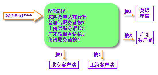 當(dāng)客戶撥打電話進(jìn)入MVB2000系統(tǒng)平臺(tái)的呼叫中心。通過IVR導(dǎo)航,可隨意打到各地的客戶端,再通過客戶端進(jìn)行更加細(xì)致的分類。并且,每個(gè)客戶端都可以互相轉(zhuǎn)接。IVR流程可以無限下拉菜單。
