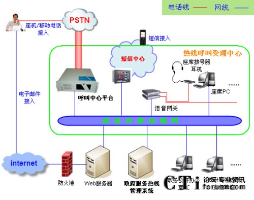 - 公民電子郵件通過internet網(wǎng)絡(luò)接入web服務(wù)器,然后通過web服務(wù)器接入呼叫中心平臺,然后進入熱線系統(tǒng);