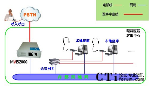 醫(yī)院采用暢信達通信MVB2000系統(tǒng)作為交換平臺,采用1路E1數(shù)字中繼線接入,對外公布統(tǒng)一的外線呼入號碼,采用語音網(wǎng)關結合話機作為座席終端,前期投入8位人工座席,系統(tǒng)架構形式如下: