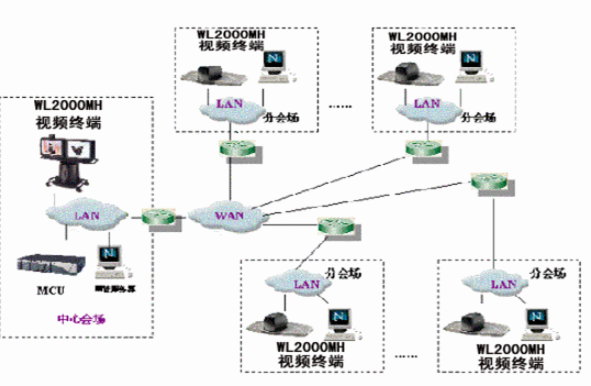 各個節(jié)點上的會議室型WL-2000MH終端的數(shù)據(jù)流可向多點控制器MCU發(fā)送動態(tài)高清晰度圖像(720*576的FULL D1), 可以把主會場攝象機畫面清晰地傳輸?shù)剿蠾L-2000MH終端。