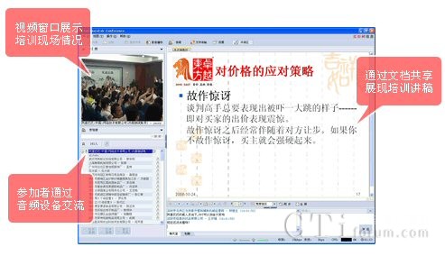 高清晰的視頻,可以讓網(wǎng)絡(luò)培訓(xùn)用戶感受培訓(xùn)現(xiàn)場氣氛。文檔共享和音頻可以讓用戶感受培訓(xùn)人員的聲情并茂。同時(shí)用戶可以在網(wǎng)絡(luò)培訓(xùn)系統(tǒng)的答疑區(qū)提出自己的問題,和培訓(xùn)人員進(jìn)行互動。