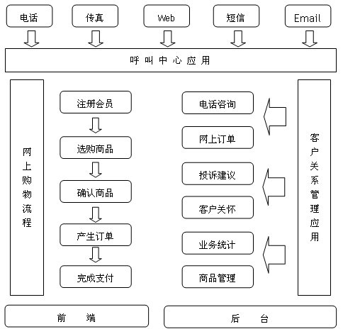 依照我公司的建設(shè)方向,中小型網(wǎng)上購物平臺的客戶服務(wù)呼叫中心系統(tǒng)應(yīng)具備呼叫中心的基本功能,同時融入了網(wǎng)上購物的客戶關(guān)系管理(CRM)流程,因此,它是呼叫中心與CRM系統(tǒng)的有機結(jié)合體,包含電話咨詢、網(wǎng)上訂單、客戶關(guān)懷等主要功能層的應(yīng)用。