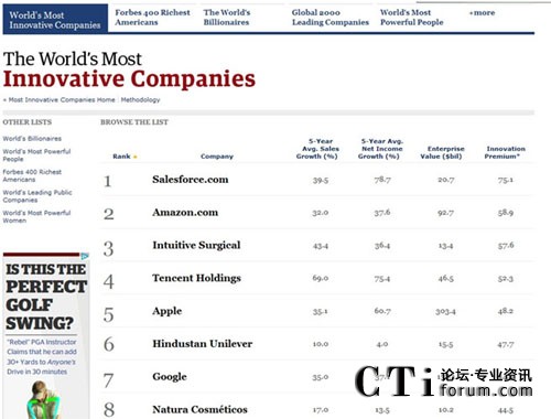 CTI論壇(ctiforum)8月15日消息(記者 張潔):2011年7月,由美國知名財經(jīng)雜志《福布斯》評選出的全球百大最具創(chuàng)新能力企業(yè)排行榜上,salesforce.com超越Facebook、蘋果、亞馬遜等知名企業(yè)位列第一。CTI論壇報道