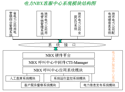 該方案以美國(guó)3COM公司的NBX產(chǎn)品為系統(tǒng)平臺(tái),結(jié)合其配套的中間件產(chǎn)品CTI-Manager和上層第三方專業(yè)的電力行業(yè)應(yīng)用系統(tǒng),為各省、市電業(yè)公司建立起新型的電力呼叫中心(Call Center)。使電力客服中心系統(tǒng)以呼叫中心為基礎(chǔ),以電力系統(tǒng)其他后方資源信息(CIS,DMS,負(fù)控等系統(tǒng))為依托,為客戶提供電話、傳真、郵件、Internet等多種接入方式,通過(guò)和電力其他業(yè)務(wù)系統(tǒng)有機(jī)的結(jié)合,滿足客戶不同層次、個(gè)性化與多樣化的業(yè)務(wù)需求,提供了包括錄音、會(huì)議電話、統(tǒng)一消息和智能路由在內(nèi)的多種功能。