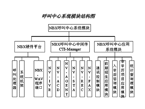 。。此呼叫中心系統(tǒng)主要由三大部分組成:美國3COM公司的NBX產(chǎn)品為系統(tǒng)平臺,及其配套的中間件產(chǎn)品CTI-Manager和上層第三方訂制的教育行業(yè)應用軟件。根據(jù)需求,應用軟件由五個功能模塊組成:通訊控制模塊、前期招生應用模塊、入學后咨詢應用模塊、非學歷項目應用模塊、統(tǒng)計查詢模塊。系統(tǒng)模塊結構圖如下: