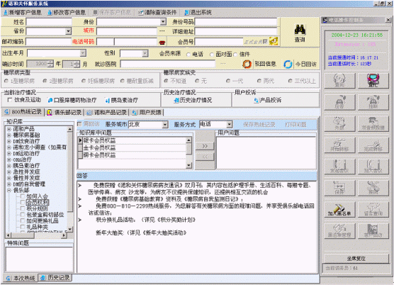 諾和關(guān)懷糖尿病服務中心的服務坐席可以實現(xiàn)患者信息的同步提示功能,當電話被分配至坐席的同時,患者的資料信息也同步出現(xiàn)在PC終端上。同時坐席終端可以自動記錄對方的電話號碼,也可以實時顯示正在排隊等待的人數(shù),提示服務人員加快業(yè)務受理速度。