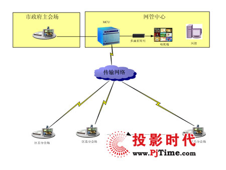 傳輸網(wǎng)絡(luò)采用4M專線,整個系統(tǒng)由控制中心、市政府主會場和18個區(qū)縣分會場組成,在控制中心配置MCU、網(wǎng)管和電視墻多畫面顯示單元,通過網(wǎng)管對系統(tǒng)實行設(shè)備的統(tǒng)一管理和會議資源的統(tǒng)一調(diào)度,控制中心配置18路電視墻集中顯示單元,通過電視墻,可實時監(jiān)看18個區(qū)縣分會場情況。在市政府主會場和18個區(qū)縣分會場,各會場配置1套高清晰視頻會議終端,各會場終端4M專線接入控制中心,實現(xiàn)全市電子政府的視頻會議系統(tǒng)。系統(tǒng)建設(shè)完成后,可實現(xiàn)導(dǎo)演控制、主席控制、點名發(fā)言、會場輪巡、攝像機(jī)遠(yuǎn)控、電視墻、多畫面、多方混音等視頻會議系統(tǒng)功能。