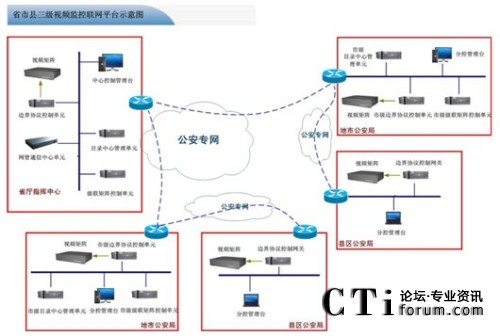 在省廳到地市之間配置視頻監(jiān)控聯(lián)網(wǎng)平臺中的核心管理調(diào)度單元、專用視頻終端、CS中心GIS控制客戶終端、邊界標準協(xié)議控制單元,地市核心管理調(diào)度單元、級聯(lián)矩陣控制中心單元、網(wǎng)管通信中心單元、中心音頻ACU調(diào)度單元、邊界標準協(xié)議控制網(wǎng)關、CS中心GIS控制客戶終端、通用型數(shù)字矩陣解碼陣列、通用標準控制矩陣鍵盤等組件構(gòu)建省至地市級公安監(jiān)控聯(lián)網(wǎng)系統(tǒng)。