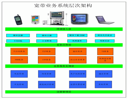 提供多種寬帶業(yè)務產(chǎn)品包,如網(wǎng)絡卡拉OK業(yè)務,持網(wǎng)絡視頻播客業(yè)務,網(wǎng)絡視寬頻視野業(yè)務,也可根據(jù)用戶需求定制拓展業(yè)務如遠程教學業(yè)務,網(wǎng)絡音像發(fā)行出版業(yè)務(數(shù)字版權保護),網(wǎng)絡電視臺業(yè)務,多媒體辦公業(yè)務等。