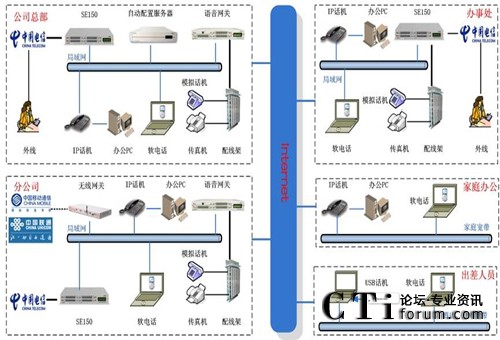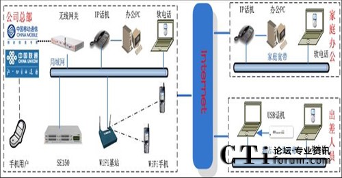 此方案適用于具有“移動(dòng)辦公、頻繁出差、家庭辦公”需求的企業(yè)。系統(tǒng)要求企業(yè)內(nèi)部部署好數(shù)據(jù)網(wǎng)絡(luò),如果采用模擬終端,則企業(yè)的各個(gè)辦公點(diǎn)需要先將網(wǎng)絡(luò)線路和電話線路部署到位。如果需要應(yīng)用WIFI終端,則需要部署WIFI網(wǎng)絡(luò)。