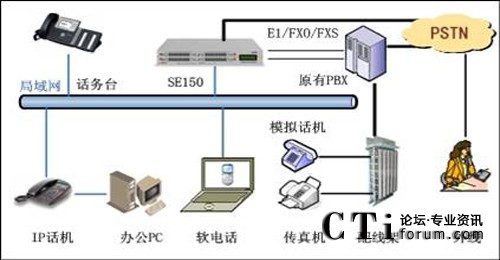 中小型企業(yè)語(yǔ)音通信系統(tǒng)集IP-PBX、語(yǔ)音網(wǎng)關(guān)、互聯(lián)網(wǎng)網(wǎng)關(guān)等多種功能于一身,可以兼容傳統(tǒng)PBX的全部功能,同時(shí)也可作為VoIP網(wǎng)關(guān)使用,把基于IP的SIP通訊轉(zhuǎn)換成PSTN通訊。通過(guò)采用開(kāi)放的標(biāo)準(zhǔn)協(xié)議,系統(tǒng)(SE150)可以兼容眾多國(guó)際、國(guó)內(nèi)IP電話、語(yǔ)音網(wǎng)關(guān)廠家的產(chǎn)品。