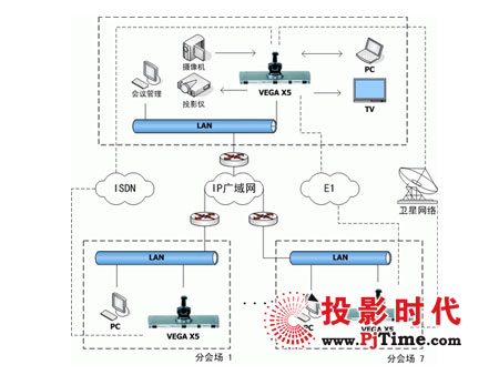 如圖所示,主會場配置1臺愛斯樂VegaX5終端,X5最高帶寬可達4Mbps。內(nèi)置8點混網(wǎng)(IP&ISDN) MCU。在每個分會場采用1臺愛斯樂VEGA X3終端。各會場根據(jù)網(wǎng)絡(luò)情況,可以采用不同的網(wǎng)絡(luò)接入方式。VEGA X5可以支持寬帶IP、ISDN、專線接入等。且X5的內(nèi)置MCU在召開多點會議時可以做雙視頻流傳送,可以同時看到多會場的圖像,聲音也是全部混合的。投影時代