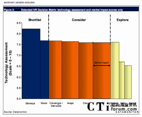 的IVR供應(yīng)商里有幸成為最優(yōu)秀的兩家供應(yīng)商之一。這個簡表包含在Datamonitor 的新聞和發(fā)布的報告里面!盀槠髽I(yè)選擇一家IVR平臺供應(yīng)商”,針對IVR供應(yīng)方市場有詳細(xì)的分析,兩家公司分別是Voxeo和Genesys,Datamonitor