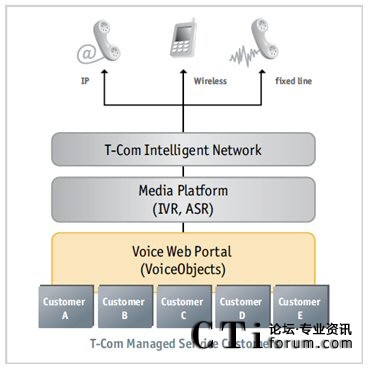 T-Com轉(zhuǎn)向VoiceObjects尋求一個可以管理成百上千應用的解決方案,確保對客戶的高可用性和可靠性,并且?guī)椭3脂F(xiàn)有和未來的開發(fā)和更改成本在一個低水平上。在2004年初,T-Com引入了語音Web門戶,一個發(fā)揮了Web基礎架構(gòu)和立足于VoiceObjects服務器網(wǎng)絡版本的語音應用服務平臺!拔覀冋趯ふ也粌H能幫助我們開發(fā),而且可以維護和管理我們的自服式電話應用的解決方案,”Klindworth說:“當時真的還沒有電話應用服務器公司目錄,但這正是我們需要的:該產(chǎn)品是服務執(zhí)行平臺,并且以Web應用服務器的方式工作。我們發(fā)現(xiàn)它就是VoiceObjects!
