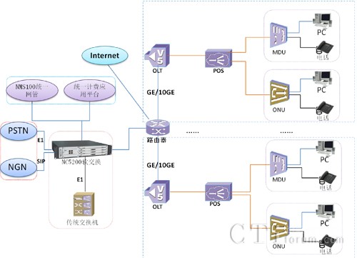 震有科技根據(jù)行業(yè)客戶的需求,推出了“NC5200系列產(chǎn)品+xPON產(chǎn)品”的行業(yè)接入網(wǎng)綜合應(yīng)用解決方案,即“NGN+xPON”行業(yè)應(yīng)用解決方案。該方案主要采用了NGN架構(gòu)的軟交換技術(shù)與xPON技術(shù)相結(jié)合,實(shí)現(xiàn)了從傳統(tǒng)的接入網(wǎng)向光纖接入網(wǎng)平滑過(guò)渡升級(jí)。該解決方案中NC5200系列產(chǎn)品主要完成語(yǔ)音交換及與語(yǔ)音相關(guān)的增值業(yè)務(wù)功能;xPON產(chǎn)品在該方案中作為語(yǔ)音、數(shù)據(jù)、視頻業(yè)務(wù)的承載平臺(tái),主要滿足了語(yǔ)音、數(shù)據(jù)及CATV或IPTV綜合業(yè)務(wù)接入要求。