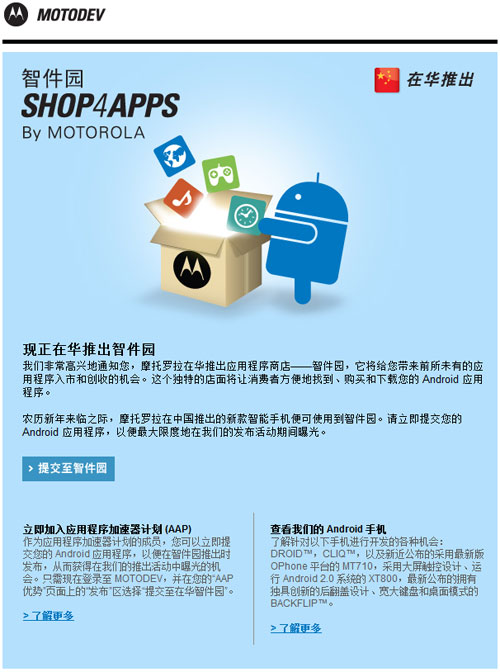2月3日消息,摩托羅拉今日正式在華推出應(yīng)用程序商城SHOP4APPS,并取中文名為“智件園”。摩托羅拉在發(fā)給MOTODEV中國注冊會員的郵件中表示,摩托羅拉在中國推出的新款智能手機(jī)便可使用到智件園。圖:摩托羅拉發(fā)給MOTODEV注冊會員的通知郵件