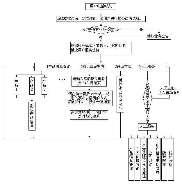 通過(guò)電腦語(yǔ)音引導(dǎo),提示按鍵的方式,用戶(hù)通過(guò)電話(huà)、傳真等可自動(dòng)獲取企業(yè)的相關(guān)信息,如公司介紹、聯(lián)系方式、產(chǎn)品信息介紹等,以及對(duì)產(chǎn)品的投訴建議,留言,留聯(lián)系電話(huà)等;