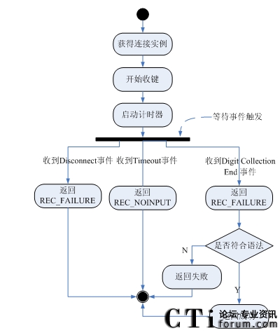 4)如果接收到SC_EVENT_DISCCONET事件,表示用戶主動放棄,返回REC_FAILURE,調(diào)用EndSession,流程結(jié)束;如果接收到SC_EVENT_TIMEOUT事件,表示用戶在計時器的時間內(nèi)沒有輸入,返回REC_NOINPUT,調(diào)用EndSession,流程結(jié)束;如果接收到SC_EVENT_DTMF_RECEIVED事件,表示用戶輸入完畢,進(jìn)入下一步;
