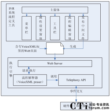 交互式語音應(yīng)答(IVR)系統(tǒng)是電話銀行呼叫中心系統(tǒng)的最前端,它的質(zhì)量直接影響整個系統(tǒng)的穩(wěn)定性和可擴展性。本文設(shè)計的IVR系統(tǒng)主要分為兩個模塊:可視化過程定義工具(用戶交互接口)、流程執(zhí)行引擎。由于過程定義工具主要是面向用戶,它的設(shè)計規(guī)范首先要符合流程的定義規(guī)則,反應(yīng)到本文中即流程工具涉及到的節(jié)點類型均符合IVR的操作動作和相關(guān)的業(yè)務(wù)動作,同時還要生成符合流程執(zhí)行引擎能處理的文件格式。在流程執(zhí)行引擎方面,符合VoiceXML的設(shè)計框架,將Web應(yīng)用和語音應(yīng)用相結(jié)合。圖3.1 IVR系統(tǒng)整體結(jié)構(gòu)圖