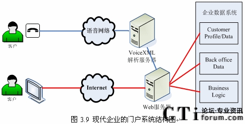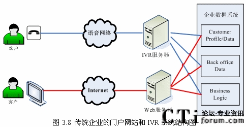 隨著Internet和Web技術(shù)的迅速發(fā)展,越來的企業(yè)開始建立自己的門戶網(wǎng)站,同時又擁有自己的IVR系統(tǒng)(如圖3.8所示),但是兩套系統(tǒng)完全獨立,語音系統(tǒng)和數(shù)據(jù)系統(tǒng)沒有任何交互或者只有很少的交互。而建立IVR系統(tǒng)的目標就是給客戶更好的體驗,使客戶能方便的通過電話完成更多以前需要登陸企業(yè)門戶網(wǎng)站,或者親自去企業(yè)或其網(wǎng)點去辦理的業(yè)務(wù),這就需要IVR系統(tǒng)能跟后臺數(shù)據(jù)系統(tǒng)有更多更好的交互!罢Z音門戶”的概念出現(xiàn)也愈發(fā)的證明這一點。