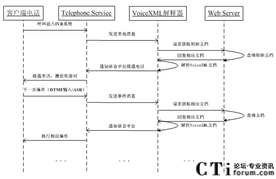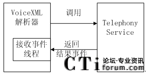 當VoiceXML解析器做完解析工作之后,遇到需要語音操作時,就得依靠調(diào)用Telephoney API來完成,同時Telephony Service需要向VoiceXML解析器去返回相應(yīng)的語音操作結(jié)果事件。圖3.15描述了這一過程。