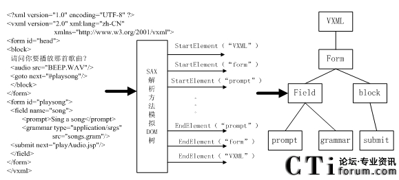 在本文設(shè)計的系統(tǒng)中,采用了DOM接口和SAX相結(jié)合的方式:使用SAX構(gòu)建DOM樹,主要是因為對VoiceXML語言解釋的過程中,需要反復(fù)瀏覽不同的接點元素,采用DOM