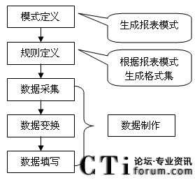 報表生成流程分為模式定義、規(guī)則定義和數(shù)據(jù)制作三個部分。規(guī)則定義需要引用模式定義的結(jié)果,而數(shù)據(jù)制作需要引用規(guī)則定義的結(jié)果。因此,需要遵循模式定義――規(guī)則定義――數(shù)據(jù)制作的順序過程。其流程如圖3.10所示。