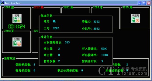 通過(guò)坐席監(jiān)控程序,呼叫中心管理人員可以實(shí)時(shí)監(jiān)控座席的登錄時(shí)間、當(dāng)前狀態(tài)(空閑、忙于外線或內(nèi)線、正在振鈴、免打擾、限制時(shí)間、報(bào)警、退出等)、當(dāng)前狀態(tài)的起始時(shí)間、持續(xù)時(shí)間、與誰(shuí)連接等,從而實(shí)現(xiàn)簡(jiǎn)單明了的質(zhì)檢功能。我們實(shí)現(xiàn)了兩種坐席監(jiān)控:C/S模式和B/S模式。CTI論壇編輯