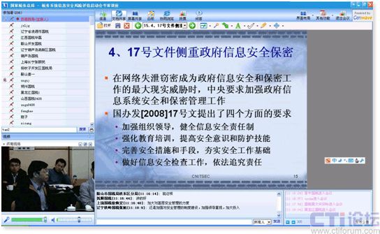 CTI論壇(ctiforum)05月07日消息: 4月8日-9日國家稅務總局組織全國省國稅地稅局IT主任與解放軍總參三院、中國信息安全評測中心、神州網御70多人在濟南錦繡山莊以及全國各地國稅地稅相關人員200多人使用自己辦公室的電腦通過盛維(Cenwave)新世紀提供的網絡視頻直播系統召開“國家稅務系統信息安全風險評估啟動會”。此次會議是國家稅務總局首次租用網絡視頻會議直播系統召開全國性會議也是參會人數最多的一次,不僅打破地點人數的限制、克服了硬件設備的局限、節(jié)省行政成本,也是建設“兩型社會”的具體體現。CTI論壇報道