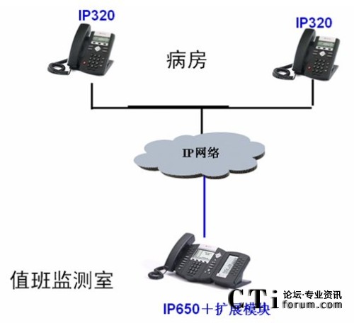 病房的IP550話機可以設置成摘機直通值班室的熱線模式,病房只要拿起聽筒,電話自動接通值班室,無需撥號。如果需要,病房同樣也可將IP550上設置成一鍵通話模式,定義值班室的快速通話按鍵,出現(xiàn)問題時一鍵接通值班室。