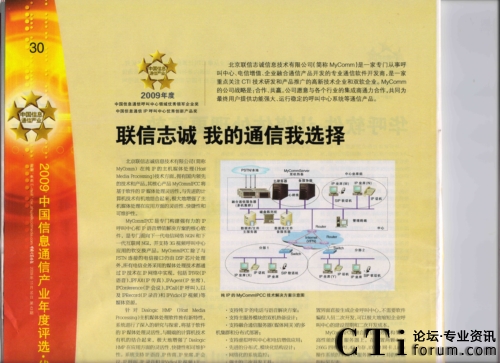 CTI論壇(ctiforum)11月24日消息(記者 張塵):日前,在中國(guó)計(jì)算機(jī)報(bào)社開(kāi)展了2009年度中國(guó)信息通信產(chǎn)業(yè)年度獎(jiǎng)項(xiàng)評(píng)選活動(dòng),北京聯(lián)信志誠(chéng)信息技術(shù)有限公司(簡(jiǎn)稱(chēng)“MyComm公司”)憑借領(lǐng)先的IP語(yǔ)音通信技術(shù)優(yōu)勢(shì),以其長(zhǎng)久以來(lái)業(yè)界口碑和今年所取得優(yōu)秀業(yè)績(jī),榮獲2009年度中國(guó)信息通信呼叫中心領(lǐng)域領(lǐng)軍企業(yè)獎(jiǎng)和2009年度中國(guó)信息通信IP呼叫中心優(yōu)秀創(chuàng)新產(chǎn)品獎(jiǎng)。CTI論壇報(bào)道