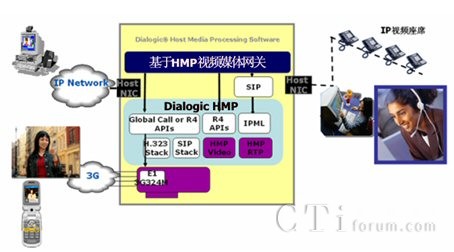 基于Dialogic HMP(Host Media processing)主機媒體處理技術的視頻呼叫中心主要通過網(wǎng)絡接口卡(“瘦卡”,Digital Network Interface卡)與PSTN(3G)相連。這里的PSTN包括電信、聯(lián)通和移動等電信運營商。也可以通過H.323、SIP協(xié)議棧直接接受來自數(shù)據(jù)網(wǎng)絡的多媒體呼叫。
