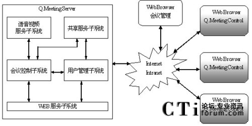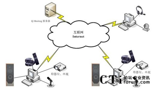 系統(tǒng)選用北京億方連線通訊技術有限公司具有國際先進水平的全新第四代網(wǎng)絡視頻協(xié)作會議中心Q.Meeting為核心進行構建,該系統(tǒng)由會議服務器Q.Meeting Server和基于IE 瀏覽器的客戶端組成。Q.Meeting Server運行于一臺服務器上,構成網(wǎng)絡會議中心,提供會議控制、視頻服務、語音服務、共享服務、WEB服務和會議用戶管理等功能。所有參加會議的人員只需通過IE瀏覽器訪問會議中心網(wǎng)站就可以參加會議,通過訪問會議頁面和嵌于其中的客戶端插件Q.Meeting Control實現(xiàn)音頻和數(shù)據(jù)共享等交流。