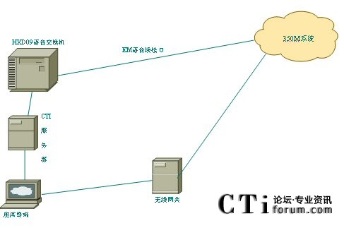 HXD09交換機(jī)通過EM接口與350M的語音線連接,當(dāng)需要呼叫某一無線終端時(shí),由座席端發(fā)起呼叫請(qǐng)求到無線網(wǎng)關(guān),當(dāng)獲取到無線網(wǎng)關(guān)返回的語音通道后,HXD09交換機(jī)將和350M系統(tǒng)對(duì)應(yīng)的語音通道連接起來,實(shí)現(xiàn)有線座席和無線終端之間的通話,并可對(duì)通話進(jìn)行錄音;座席也可插入到無線終端或者某一集群之間,實(shí)現(xiàn)監(jiān)聽或者插話,這一過程同樣可以全程錄音。