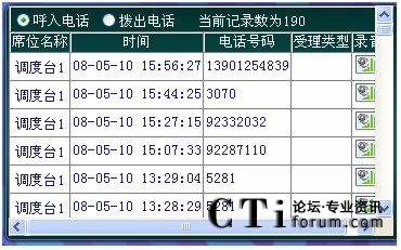 當(dāng)電話打進(jìn)來(lái),話務(wù)員提話機(jī)時(shí)系統(tǒng)便自動(dòng)進(jìn)行錄音,系統(tǒng)把語(yǔ)音信號(hào)以數(shù)字化語(yǔ)音格式寫入硬盤。同時(shí)系統(tǒng)記錄其通話日期、摘機(jī)時(shí)間、掛機(jī)時(shí)間和當(dāng)前通話時(shí)間等信息,如果該次電話為打出電話,還可記錄其打出的電話號(hào)碼。當(dāng)值班人員掛機(jī)時(shí)系統(tǒng)便會(huì)自動(dòng)停止錄音。