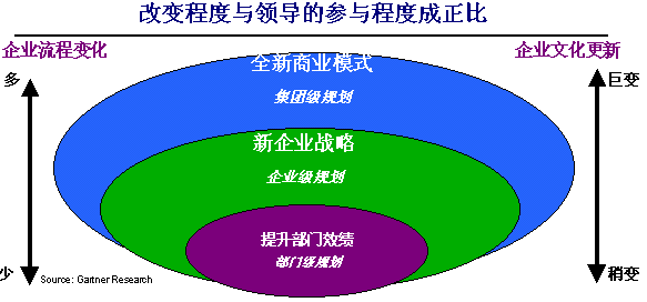 成功實施CRM的第一個關(guān)鍵是贏得企業(yè)的高層支持。高層支持的項目,或稱“一把手”工程,往往能夠推行得比較順利。在我們的實施中,最經(jīng)常項目牽頭人是客戶方負責運營的老總或總經(jīng)理。企業(yè)要應用CRM系統(tǒng),不應當僅僅是信息部門或銷售部門內(nèi)部的事情,而應當是整個企業(yè)在高層領(lǐng)導的直接參與指導之下的多方協(xié)同調(diào)整,因為CRM涉及的是市場、銷售、服務等多個與客戶打交道的部門和流程。企業(yè)內(nèi)部的高層管理者必須承擔起項目負責人的角色,才能讓CRM實施順利地開展,才能完成部門之間的協(xié)同,才能實現(xiàn)企業(yè)內(nèi)部的文化轉(zhuǎn)變。高層參與的程度可以由下面的圖示說明: