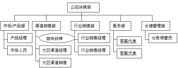 除分銷渠道管理之外,紫光網(wǎng)聯(lián)的前端管理組織機(jī)構(gòu)還包括市場(chǎng)/產(chǎn)品部、行業(yè)銷售部、服務(wù)部和倉(cāng)儲(chǔ)管理部門。示意圖如下: