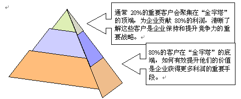 。。從抽象和通用的意義上講,多數(shù)企業(yè)的客戶(hù)價(jià)值分布是適合"二八法則"的,即20%的客戶(hù)創(chuàng)造了80%的利潤(rùn)。但對(duì)每個(gè)企業(yè)而言,要洞察"究竟哪些客戶(hù)才是最有價(jià)值的客戶(hù)?""這些客戶(hù)在哪些方面的價(jià)值最大?""他們有什么共同的特征?"卻不是一件很容易的事。目前,多數(shù)企業(yè)的管理方式還停留在根據(jù)某一項(xiàng)或兩項(xiàng)單一指標(biāo)(如銷(xiāo)售額或利潤(rùn))來(lái)作的客戶(hù)排行,無(wú)法進(jìn)行多方位的綜合的客戶(hù)價(jià)值分析、管理。而要實(shí)現(xiàn)"以客戶(hù)為中心"的CRM理念,就必須建立一套全面的客戶(hù)價(jià)值評(píng)估管理系統(tǒng),并利用系統(tǒng)強(qiáng)大的數(shù)據(jù)分析、挖掘功能,快速地進(jìn)行客戶(hù)群價(jià)值細(xì)分管理,建立起客戶(hù)價(jià)值金字塔。