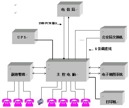 電信局交換機(jī)提供單獨(dú)數(shù)字2MB PCM中繼接口,通過HDSL傳輸設(shè)備或光端機(jī)設(shè)備將中繼接口連接到公安局指揮中心。若電信局與公安局距離小于500米,則可直接使用75歐姆電纜將中繼接口連接到公安局指揮中心。 該數(shù)字2MB PCM中繼接口的數(shù)據(jù)可以作成110/119/122混合編程,數(shù)據(jù)采用收全碼方式,被叫控制掛機(jī)。
