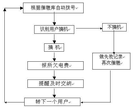 。。催費工作是由指定的欠費數(shù)據(jù)文件(或欠費數(shù)據(jù)庫)中提取用戶電話號碼和欠費金額,自動順序向各欠費用戶撥號,撥通后自動播放催費通知并通報欠費金額數(shù)。系統(tǒng)自動統(tǒng)計通話結(jié)果,系統(tǒng)對未應(yīng)答用戶會自動重復(fù)多次撥叫。