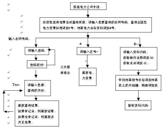 。。當(dāng)用戶得知需要繳納電費時,可撥打電力公司查詢熱線,聽到問候語后輸入合同號碼,系統(tǒng)即可自動播放用戶查詢月份的電費發(fā)生情況。