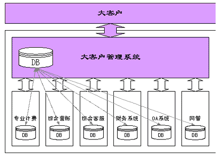 電信企業(yè)大客戶管理系統(tǒng)是電信企業(yè)信息系統(tǒng)中的一個(gè)組成部分,與其它業(yè)務(wù)系統(tǒng)如大客戶服務(wù)系統(tǒng)、綜合營帳、財(cái)務(wù)系統(tǒng)、計(jì)費(fèi)系統(tǒng)、OA系統(tǒng)、網(wǎng)管系統(tǒng)等都有著不可分割的聯(lián)系,它需要從這些系統(tǒng)中提取相應(yīng)的數(shù)據(jù)并且把相應(yīng)的數(shù)據(jù)傳輸?shù)狡渌到y(tǒng),或者和這些系統(tǒng)一起完成系統(tǒng)的某些重要功能,如合同跟蹤等。而且大客戶管理系統(tǒng)也會(huì)極大影響各個(gè)業(yè)務(wù)系統(tǒng)的運(yùn)行,大客戶系統(tǒng)與相關(guān)系統(tǒng)之間的關(guān)系如下圖所示: