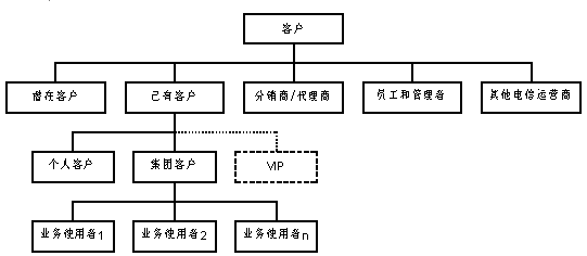 同時(shí),客戶服務(wù)中心的服務(wù)對象進(jìn)一步擴(kuò)大,按照是否已經(jīng)使用該電信運(yùn)營商提供的電信業(yè)務(wù)將客戶劃分為:潛在客戶、已有客戶。這里的潛在客戶并不針對某一具體的電信業(yè)務(wù),而是針對電信運(yùn)營商整體而言。其中,已有客戶又分為個(gè)人客戶和集團(tuán)客戶。集團(tuán)客戶內(nèi)部存在多個(gè)業(yè)務(wù)使用者,這些業(yè)務(wù)使用者本身也是客服系統(tǒng)的客戶。分銷/代理商代為發(fā)展電信運(yùn)營商的客戶,同時(shí)他們也可以單獨(dú)作為一種特殊客戶享有客服系統(tǒng)提供的服務(wù)。在個(gè)人客戶和集團(tuán)客戶中,均會有一部分成為特殊的VIP。此外,對客服系統(tǒng)來說,電信運(yùn)營商的員工和管理者也是"客戶";同時(shí),從網(wǎng)間互聯(lián)和網(wǎng)間結(jié)算的角度,其它運(yùn)營商也應(yīng)該按照客戶來對待。